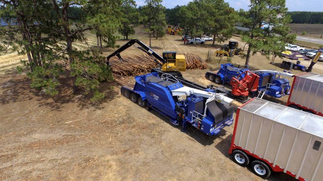 The 6300B Drum Chipper has two drum configurations, a 8-pocket drum to make standard biomass chips, or a 16-pocket drum to make microchips. An optional grate system has been redesigned to allow for adjustment from a microchip to a 1¼” chip with the same grates. Traditional Babbitt type knife systems are standard equipment, or an optional key knife system is available. Peterson’s chip accelerator system, adds load density, or throws chips well away from the machine for land clearing operations.